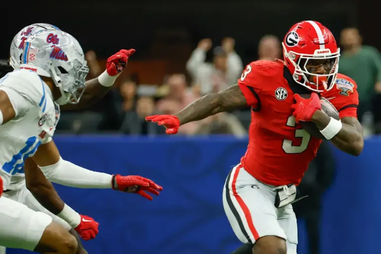 NUEVA ORLEANS – El corredor de segundo año de Georgia, Nate Frazier, lidera la carga terrestre de Georgia contra Ole...
