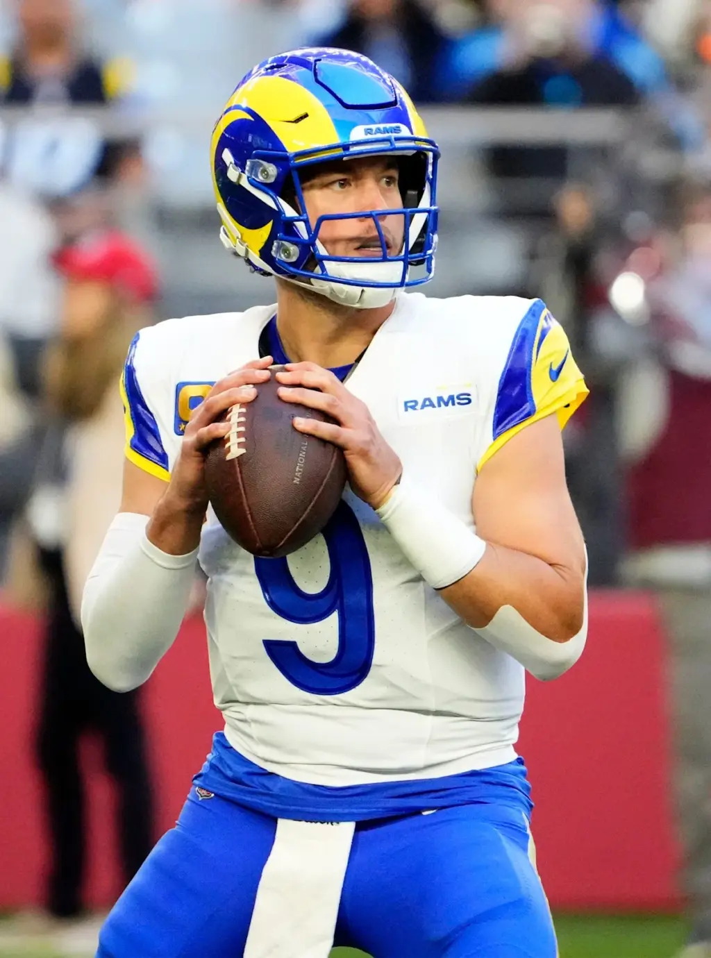 El mariscal de campo de Los Angeles Rams, Matthew Stafford (9), busca pasar contra los Arizona Cardinals en la primera mitad en el State Farm Stadium el 7 de diciembre de 2025, en Glendale, Arizona.