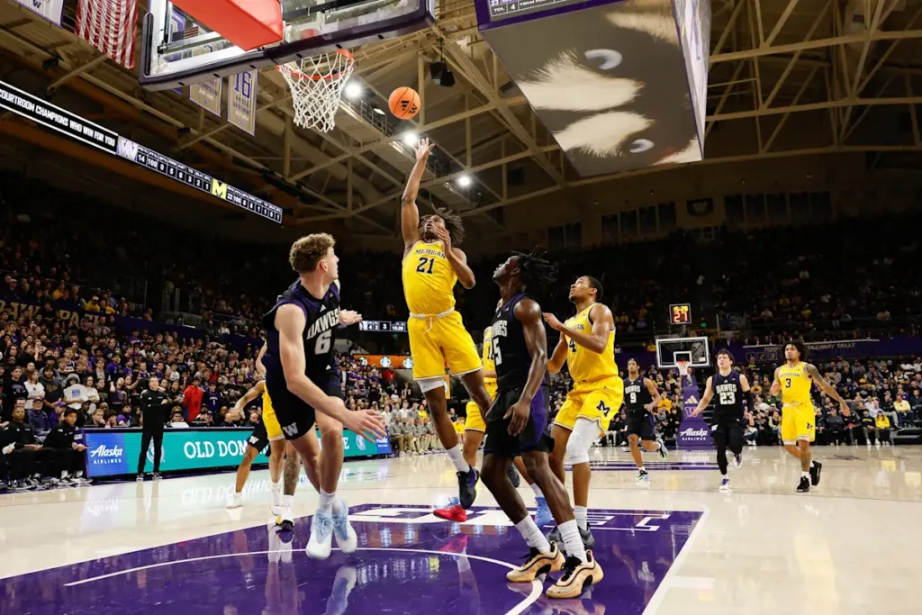 Morez Johnson Jr. de los Michigan Wolverines dispara el balón durante la primera mitad del juego contra los Washington Huskies en el Alaska Airlines Arena en Seattle el miércoles 14 de enero de 2026.