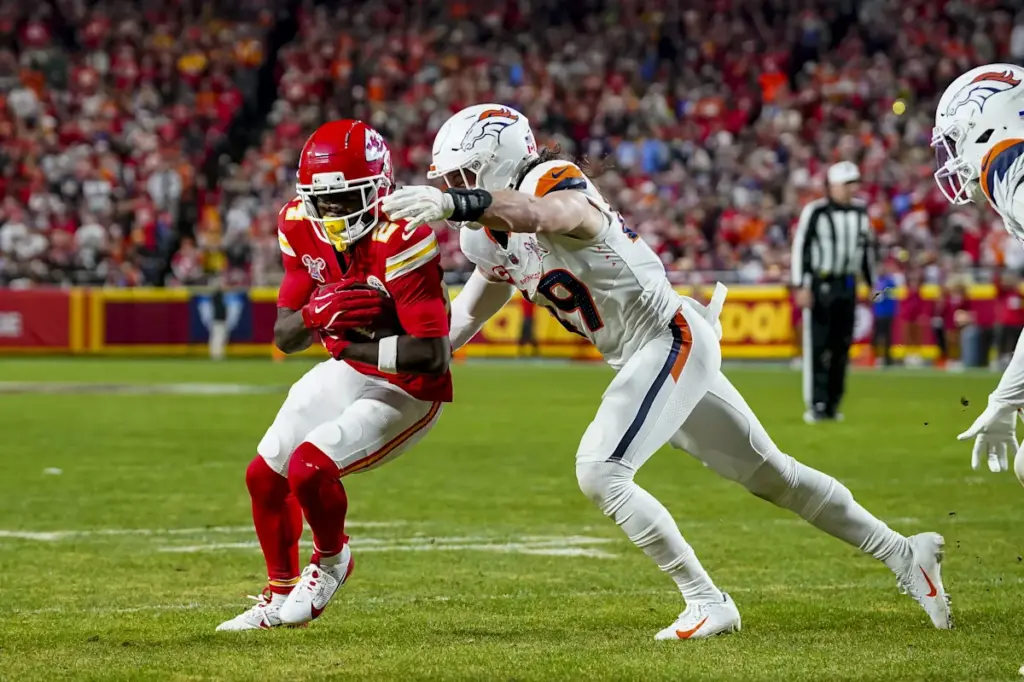 Jaleel McLaughlin atravesó la línea para lograr una gran ganancia hasta la yarda 24 de los Chiefs, la ganancia más larga del día para Denver.