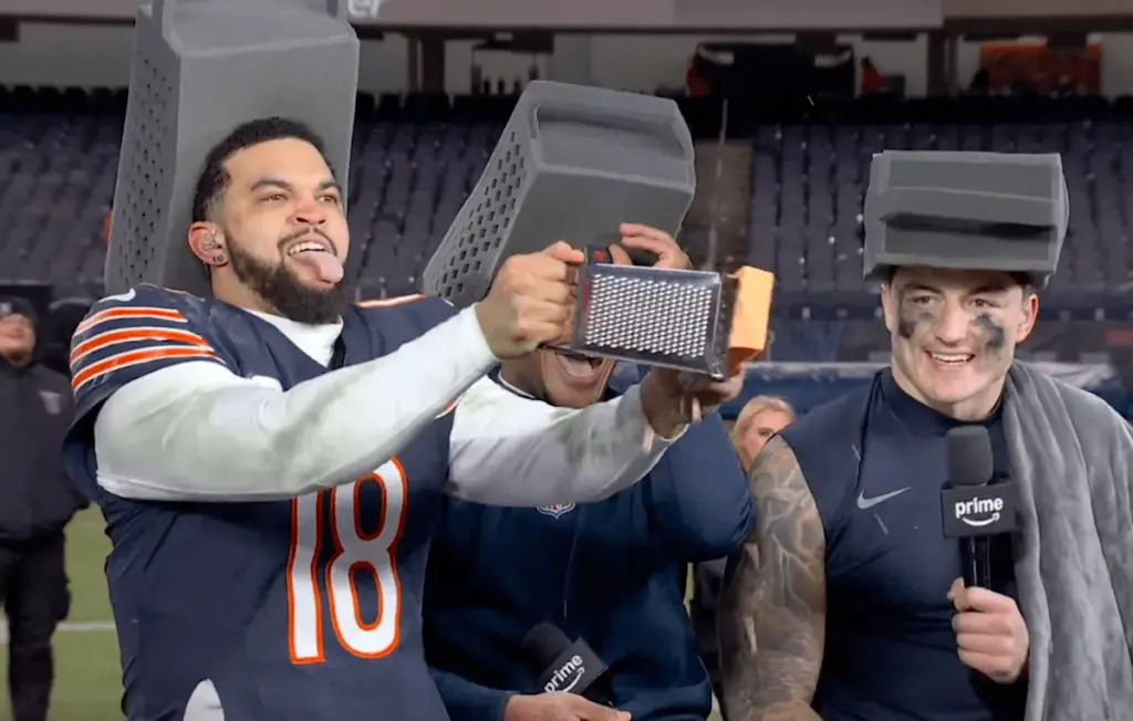 Después del juego, el equipo de Amazon Prime Video tuvo a Williams, Moore y al novato Colston Loveland en el set para hablar sobre el juego, y los sombreros de Cheese Grater regresaron, pero esta vez eran tres.