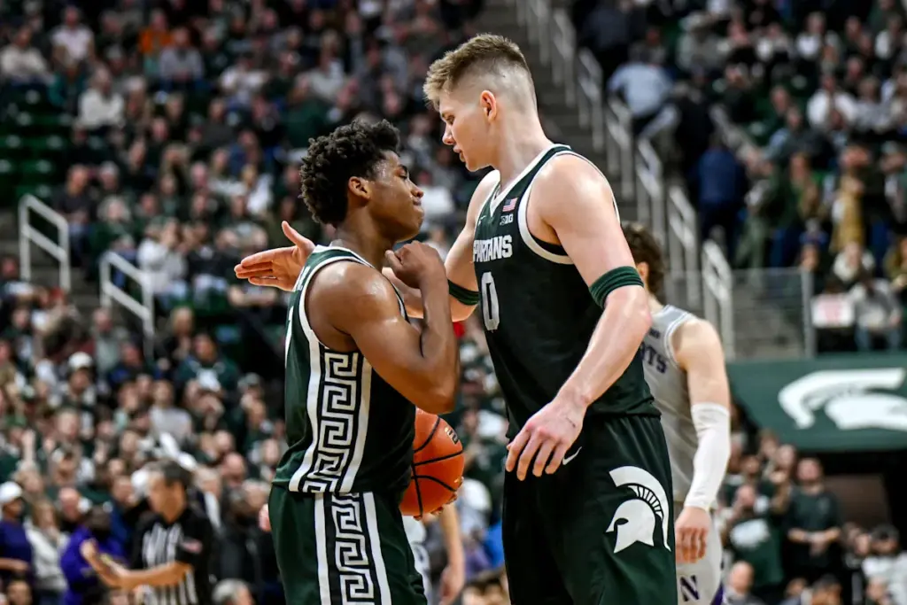 Jaxon Kohler, derecha, de Michigan State, y Jeremy Fears Jr. celebran al final de la segunda mitad del juego contra Northwestern el jueves 8 de enero de 2026 en el Breslin Center en East Lansing.