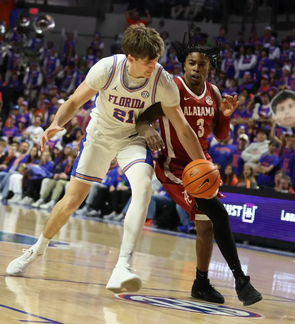 El guardia de Alabama Latrell Wrightsell Jr. (3) ensucia al delantero de Florida Alex Condon (21) mientras el entrenador principal de Florida Todd Golden Gator chomps mientras Florida gana contra Alabama durante la segunda mitad de un partido de baloncesto masculino de la NCAA en el Steven C. O'Connell Center Exactek Arena en Gainesville, FL, domingo, 1 de febrero de 2026. Florida derrotó a Alabama 100-77. (Alan Youngblood/Gainesville Sun)