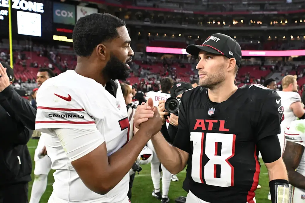 GLENDALE, ARIZONA – 21 DE DICIEMBRE: Jacoby Brissett #7 de los Arizona Cardinals y Kirk Cousins #18 de los Atlanta Falcons se enfrentan después de que los Falcons derrotaron a los Cardinals 26-19 en el State Farm Stadium el 21 de diciembre de 2025 en Glendale, Arizona. (Foto de Norm Hall/Getty Images)