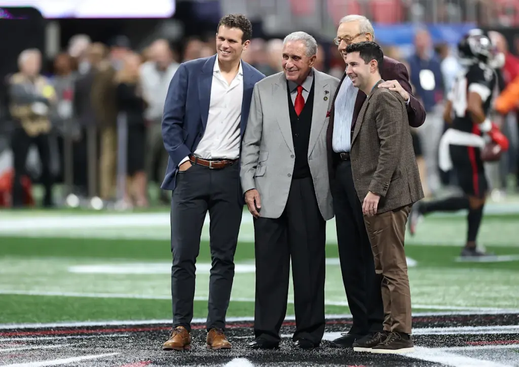 ATLANTA, GEORGIA – 26 DE OCTUBRE: El propietario de los Atlanta Falcons, Arthur Blank, posa con su hijo Josh Blank (L), el presidente y socio gerente de los Miami Dolphins, Stephen M. Ross, y el yerno de Ross, Dan Sillman (R), durante los calentamientos previos al juego entre los Miami Dolphins y los Atlanta Falcons en el estadio Mercedes-Benz el 26 de octubre de 2025 en Atlanta, Georgia. (Foto de Kevin C. Cox/Getty Images)
