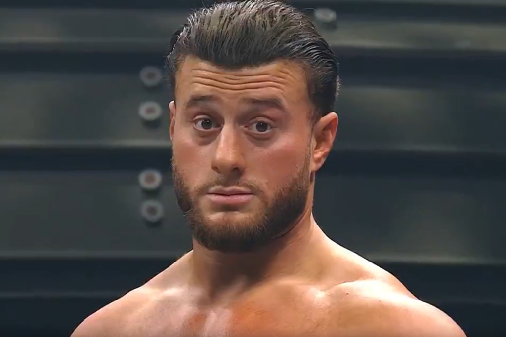 Maxwell Jacob Friedman reacciona ante la multitud de Las Vegas que canta en voz alta “F*** ICE” justo antes de su pelea en AEW con Brody King. (TBS)