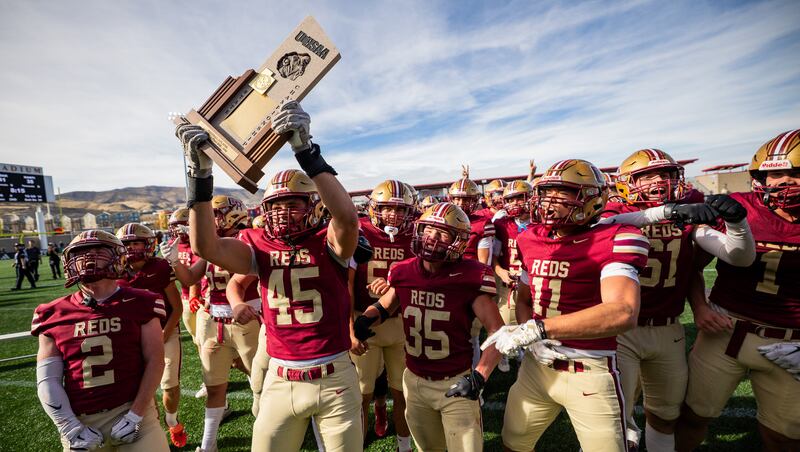 Los jugadores de Cedar Reds celebran después de ganar 41-35 contra los Manti Templars en un juego de campeonato estatal de fútbol americano de escuelas secundarias 3A en el estadio Zions Bank en Herriman el sábado 15 de noviembre de 2025. | Tess Crowley, Noticias Deseret