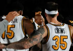 El director atlético de UCLA, Martin Jarmond, hace un gesto hacia el nuevo entrenador de fútbol Bob Chesney durante la conferencia de prensa introductoria de Bob Chesney en el Centro de Conferencias Luskin el martes 9 de diciembre de 2025 en Los Ángeles.