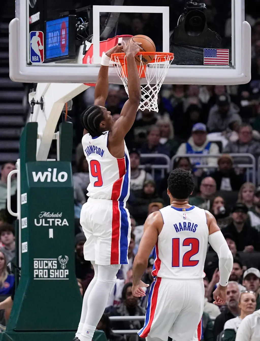 El guardia/delantero de los Detroit Pistons, Ausar Thompson (9), encesta el balón en la primera mitad contra los Milwaukee Bucks en el Fiserv Forum de Milwaukee el sábado 22 de noviembre de 2025.