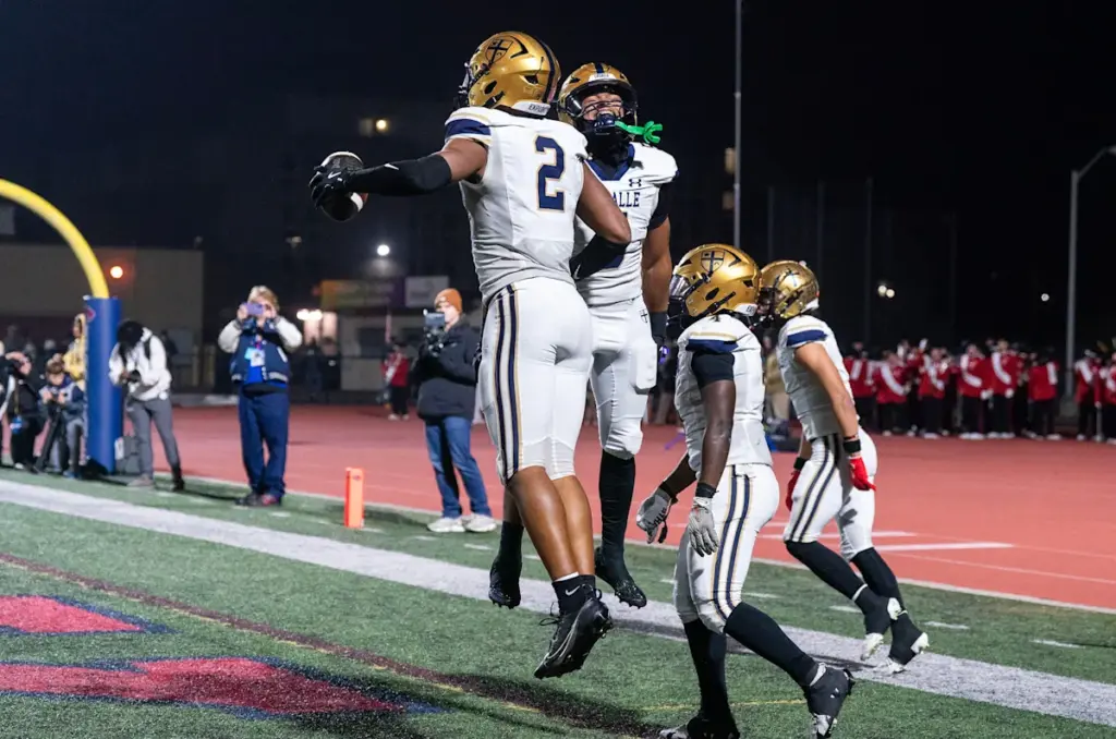 JP Oates, de 2 años, de La Salle, celebra su touchdown contra Easton con sus compañeros Joey O'Brien, de 6 años, Josh Simmons, de 8 años, y Chima Auguste, de 12 años, durante los cuartos de final de fútbol de la PIAA en Belén el 21 de noviembre de 2025.
