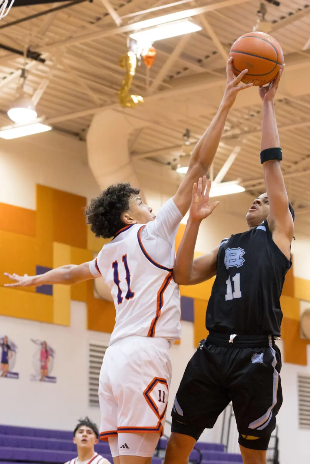 Caleb Gutiérrez (11) de Eastlake intenta bloquear a Keyshaun Lawrence (11) de Chapin durante un partido de baloncesto masculino el martes 2 de diciembre de 2025 en la Escuela Secundaria Eastlake en El Paso, Texas.
