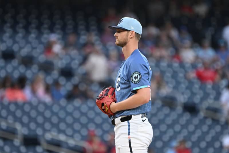 18 de julio de 2025; Washington, Distrito de Columbia, Estados Unidos; El lanzador abridor de los nacionales de Washington Michael Soroka (34) lanza contra los padres de San Diego durante la primera entrada en Nationals Park. Crédito obligatorio: Geoff Burke-Imagn Images