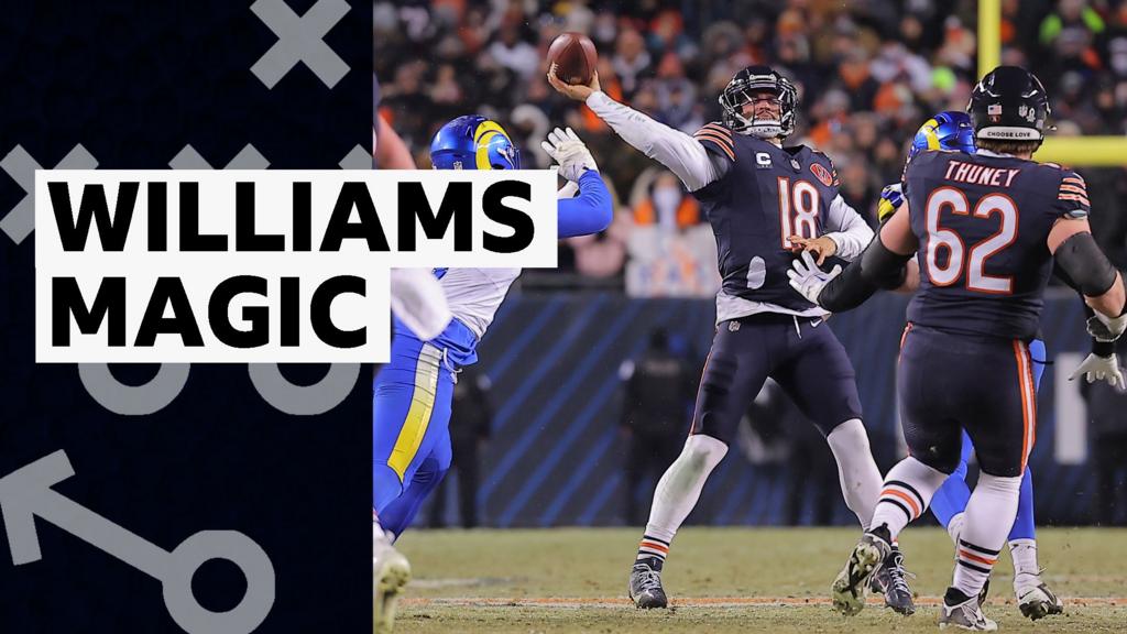 El mariscal de campo de los Chicago Bears, Caleb Williams, produce un impresionante pase de touchdown a Cole Kmet en los últimos segundos del tiempo reglamentario para forzar el tiempo extra contra Los Angeles Rams en su juego de la Ronda Divisional de la NFC.
