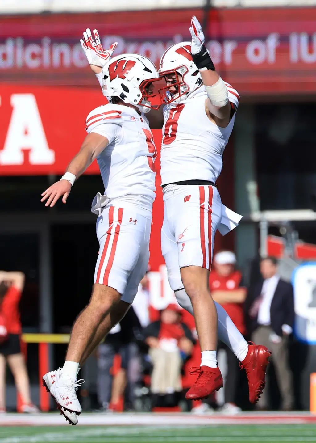 BLOOMINGTON, INDIANA – 15 DE NOVIEMBRE: Carter Smith # 5 de los Wisconsin Badgers celebra un touchdown con Vinny Anthony II # 8 de los Wisconsin Badgers durante el segundo cuarto contra los Indiana Hoosiers en el Memorial Stadium el 15 de noviembre de 2025 en Bloomington, Indiana. (Foto de Justin Casterline/Getty Images)