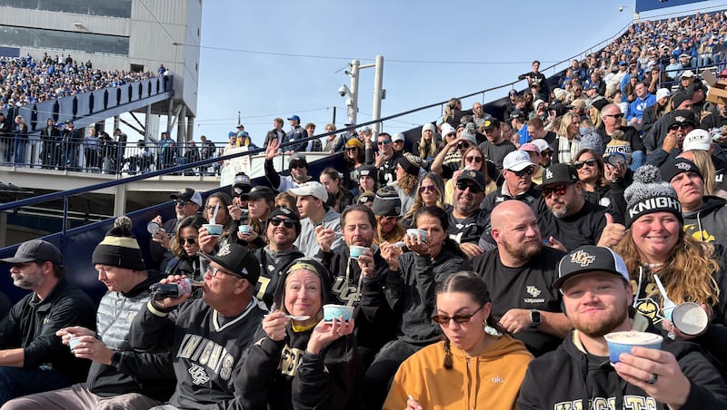 El élder Gerrit W. Gong y la hermana Susan Gong participan en la diplomacia del helado, entregando obsequios a los fanáticos de la UCF durante la victoria de BYU por 41-21 en el estadio LaVell Edwards en Provo, Utah, el sábado 29 de noviembre de 2025. | Cortesía de Michael Mower
