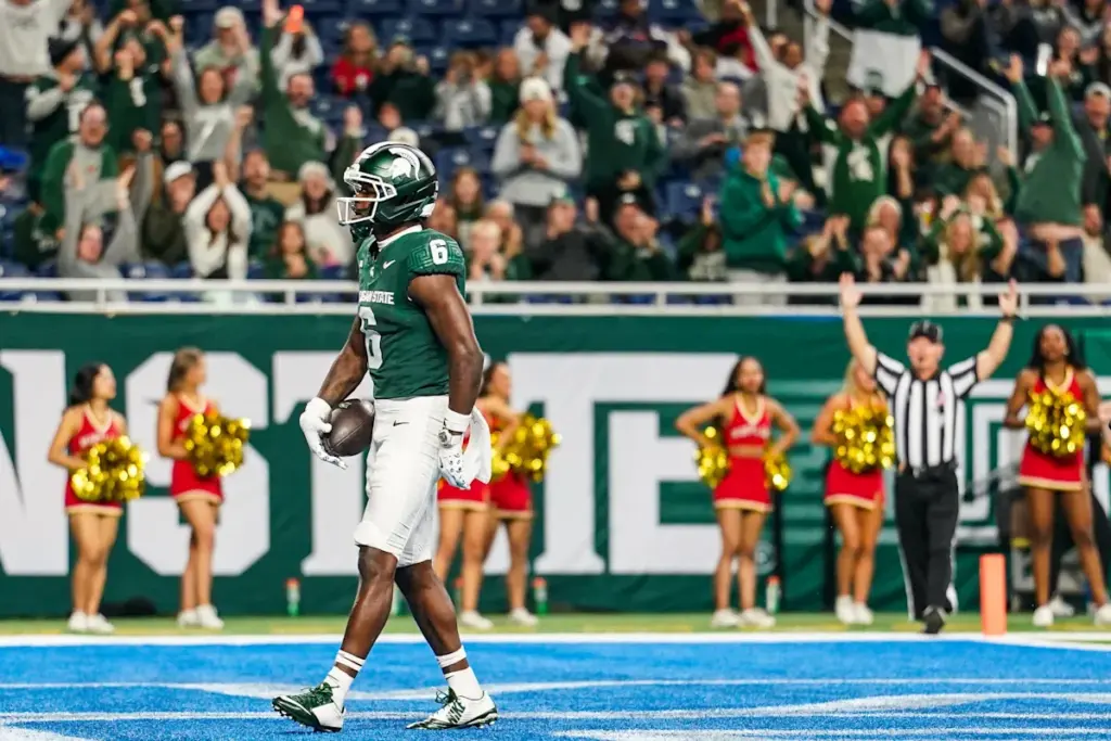 El receptor abierto del estado de Michigan, Nick Marsh (6), celebra un touchdown contra Maryland durante la primera mitad en Ford Field en Detroit, el sábado 29 de noviembre de 2025.